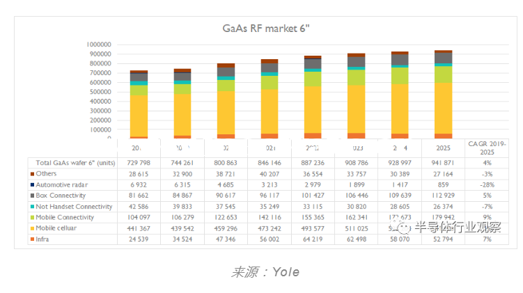 Yole預(yù)測(cè),從2019年到2025年,GaAs wafer 6"消耗量將保持4%的復(fù)合年增長(zhǎng)率,晶圓需求量從74.4萬(wàn)片/年增加到94.1萬(wàn)片/年。